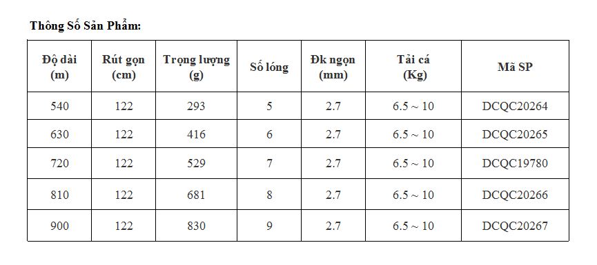 Độ dài: 5m4 – 6m3 – 7m2 – 8m1 – 9m
